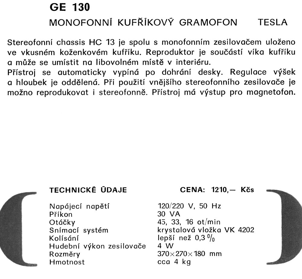 | Popis | Monofónny kufríková gramofón, 16, 33, 45 ot/min, 4W zosilňovač, váha 4 kg. Výroba Tesla, Litovel, n.p. |