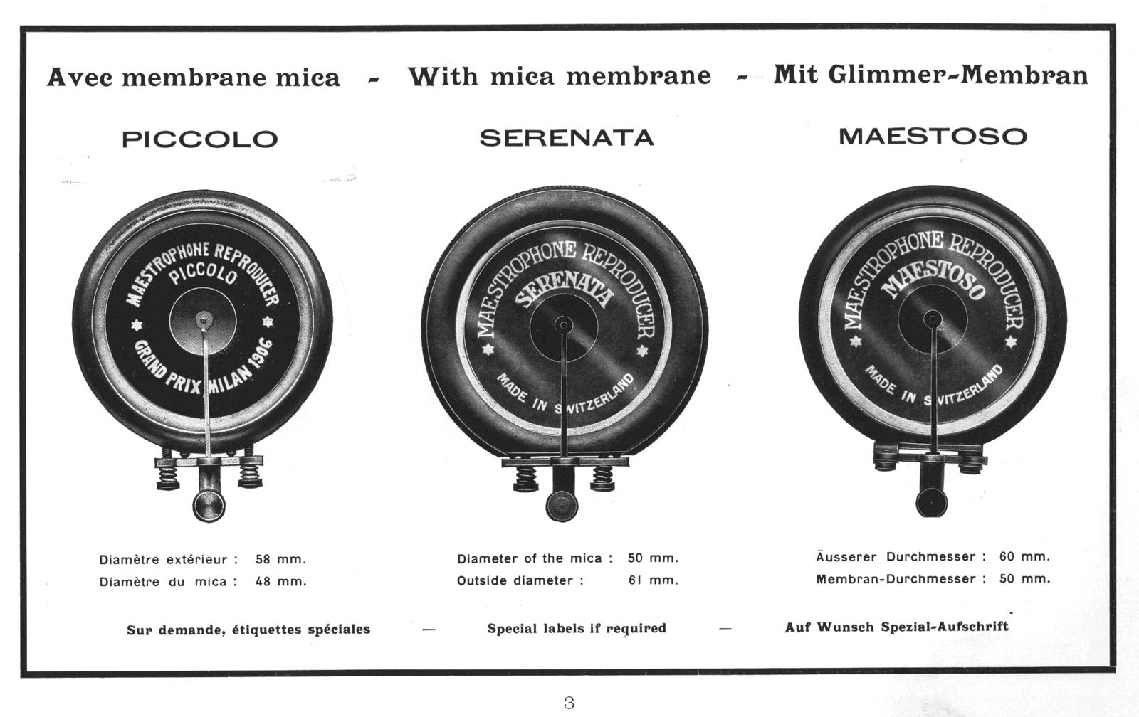| Popis | Sortiment malých gramofónových ozvučníc, k mechanickým gramofónom, a prenosiek, Piccolo, Serenata, Maestoso, ... Obsahuje aj dobový cenník |