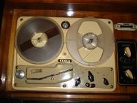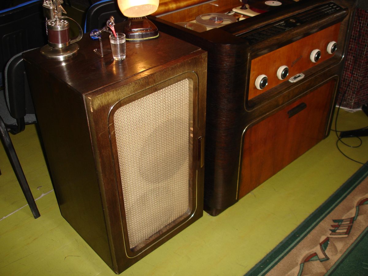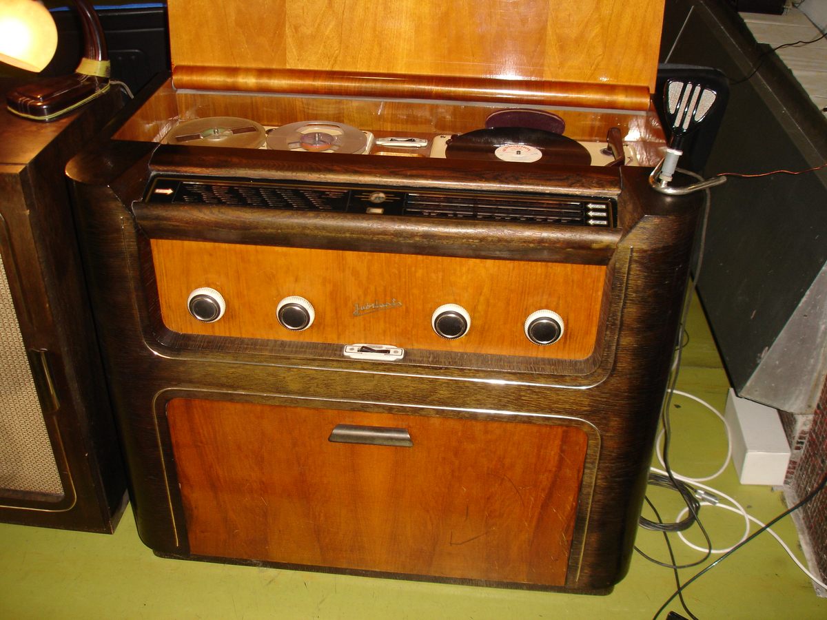 | Popis | Luxusná trojkombinácia: 7-okruhový superhet s pásmovým filtrom a štyrmi vlnovými rozsahmi, trojrýchlostný (33, 45, 78 ot/min)gramofón a dvorýchlostný(9,5 a 19 cm/s)cievkový magnetofón v jednej skrini, napájanie na striedavý prúd. Drevená skriňa rozmerov 960 x 870 x 530 mm s výklopným úložným priestorom pre platne aj cievky s pásom, mosadzné nápisy. Sklenená stupnica v metroch s názvami vysielačov je dvojdielna, s dvojicou súbežných ukazovateľov. V hornej časti je osvetlený priestor s gramom a magnetofónom a prepínač funkcií. K prístroju patrí oddelená reproskriňa rozmerov 420 x 830 x 530 mm a obsahuje štyri kruhové reproduktory, dva 260 mm a dva 100 mm. Prijímač má vo výbave magické oko, päťstupňový prepínač tónovej clony a šírky pásma, prípojky pre mikrofón aj drôtový rozhlas, dvojčinný koncový stupeň s výkonom 8 W. |